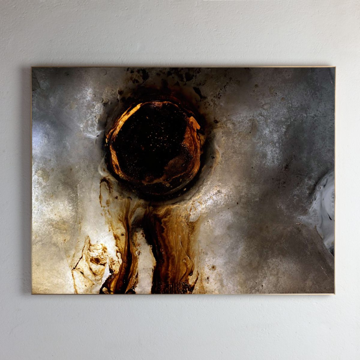 a large ossuary of crude oil & river water taken directly from below the thick ice of the Yenesei river are frozen together in temperatures below minus 50 degrees. This is done in a field studio deep in the forests of Siberia specifically to enable a thermo dynamic process ´enthalpy of fusion´.  Vast pressures are created inside the sculpture, resulting in unrepeatable gas formations, fissures & wax secretions that are then photographed on analogue film plates