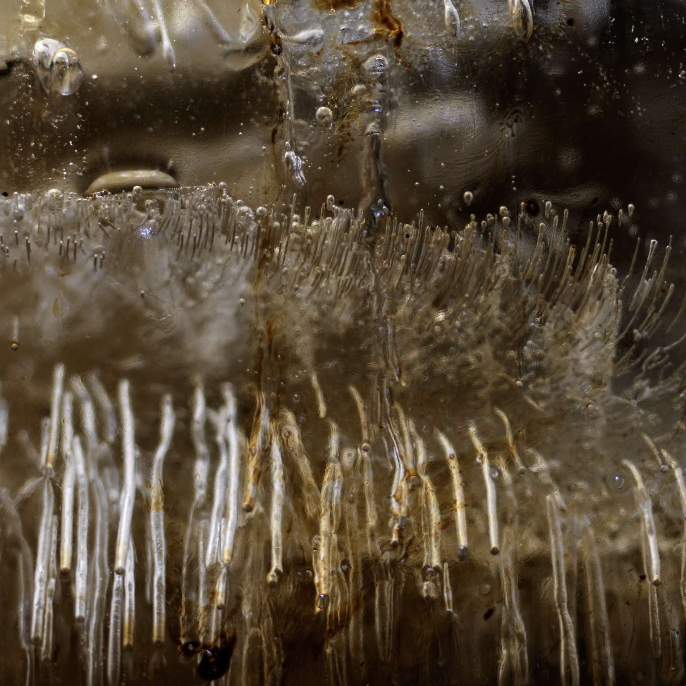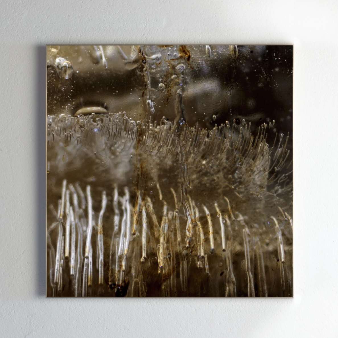 a large ossuary of crude oil & river water taken directly from below the thick ice of the Yenesei river are frozen together in temperatures below minus 50 degrees. This is done in a field studio deep in the forests of Siberia specifically to enable a thermo dynamic process ´enthalpy of fusion´. Vast pressures are created inside the sculpture, resulting in unrepeatable gas formations, fissures & wax secretions that are then photographed on analogue film plates