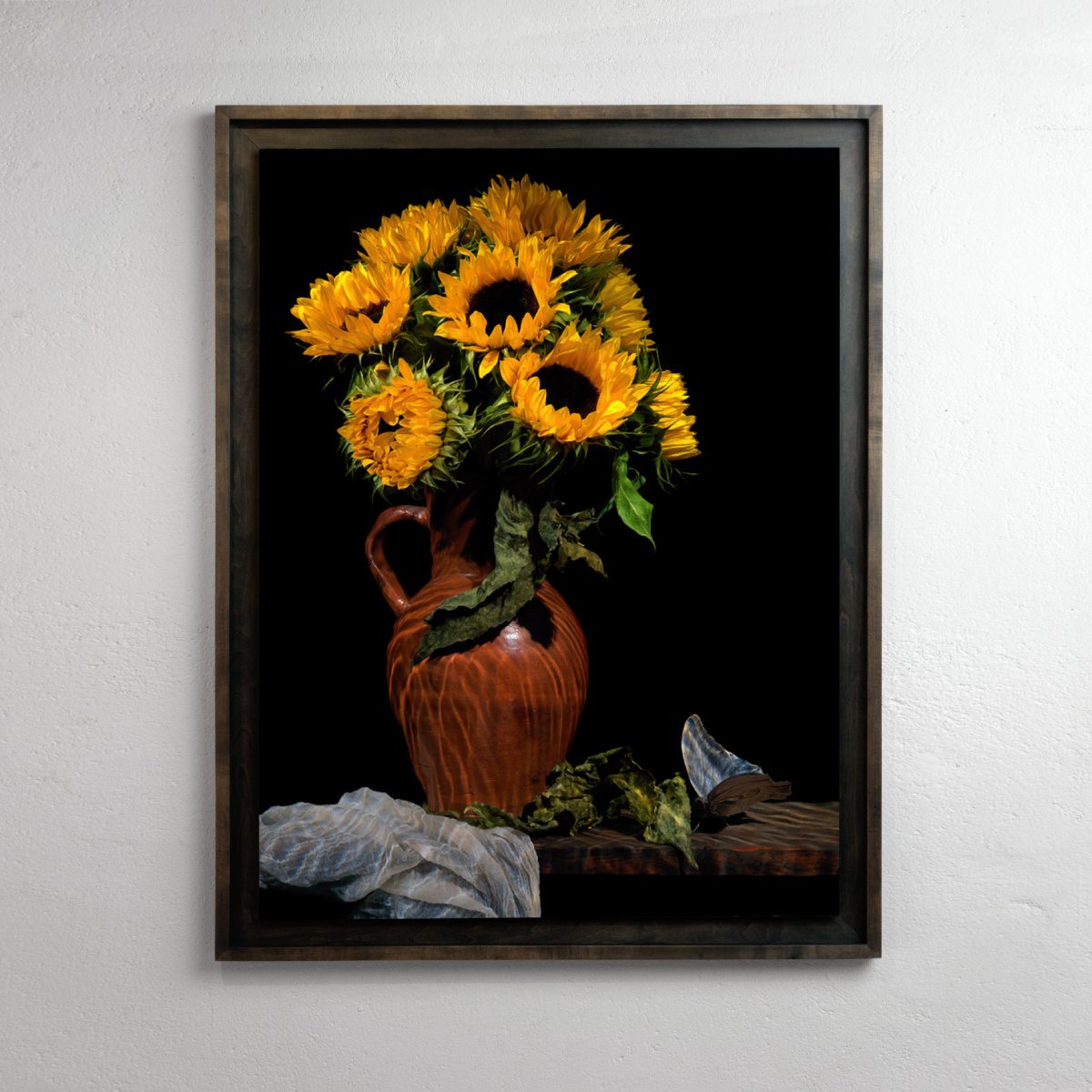a Vanitas still life tableau constructed entirely underwater, using artist-grown flowers, studio-reared butterflies and period objects that is then photographed directly in camera without digital intervention.