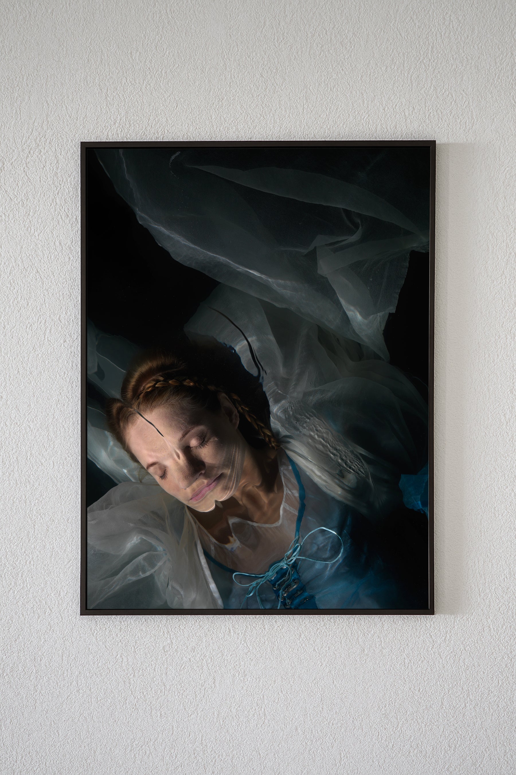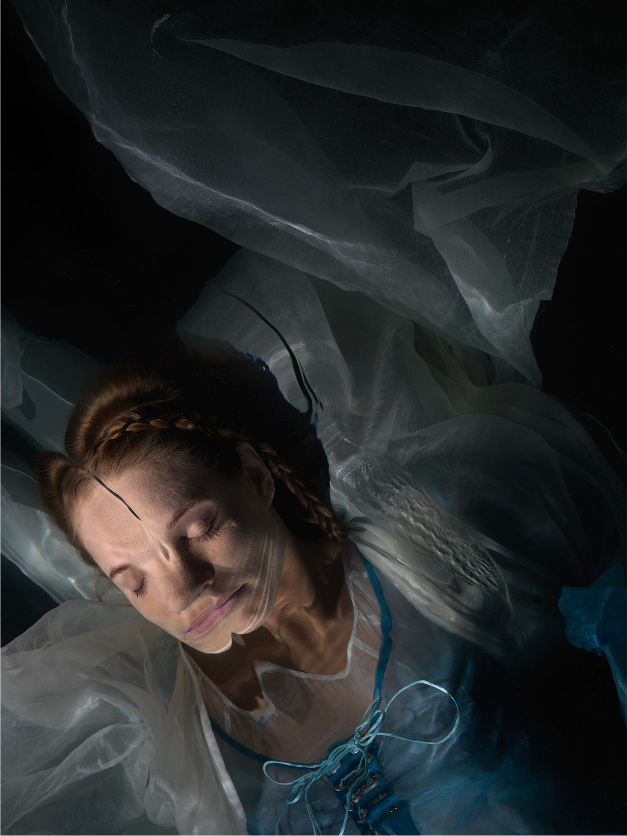 every element of this figurative underwater scene is hand crafted in the studio, including the gown and 24ct gold halo, then photographed on an analogue 8 x 10 inch camera plate
