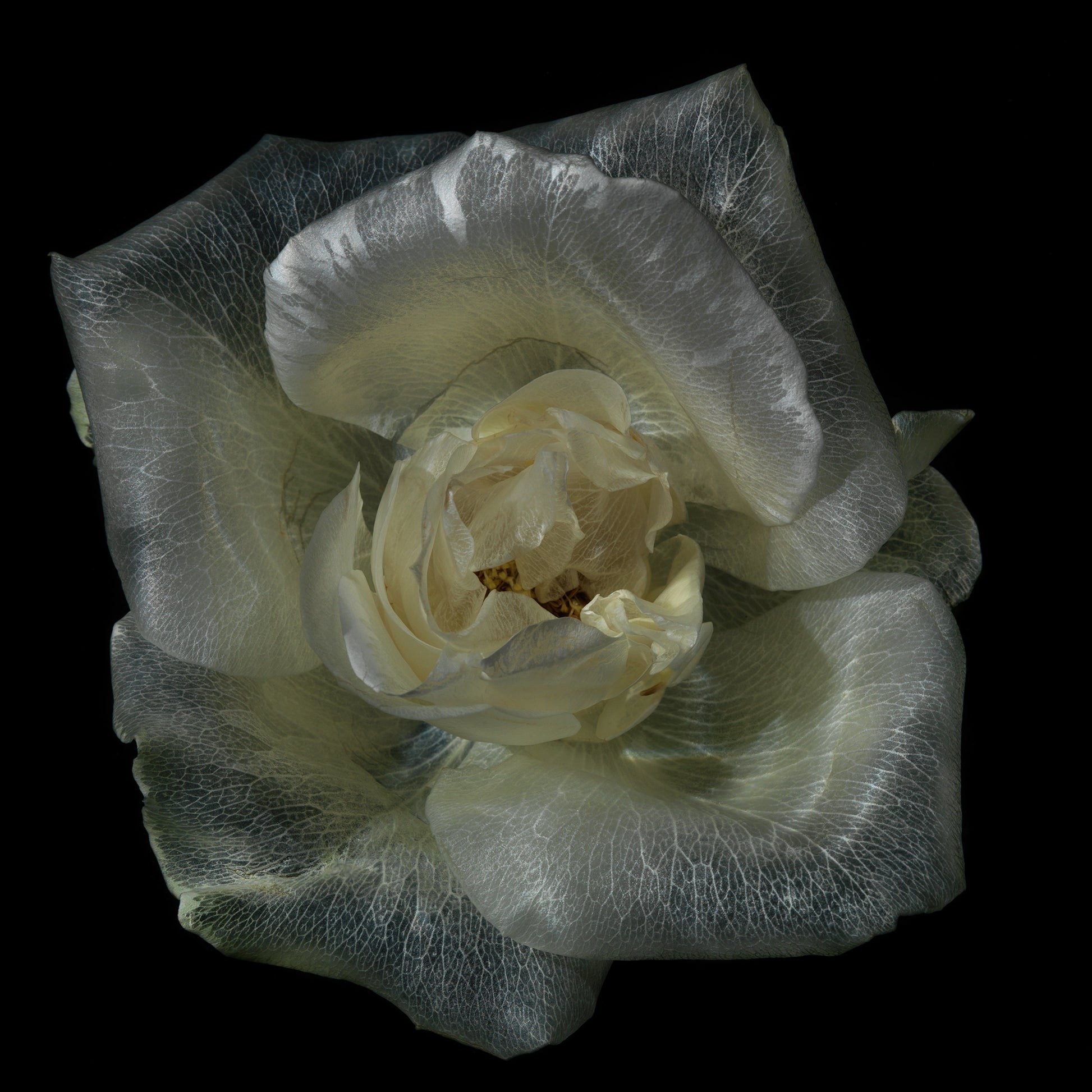 a single flower specimen undergoes an underwater process where purified water replaces the colour pigmentation in the flowers petals, leaving behind its skeletal vein structure
