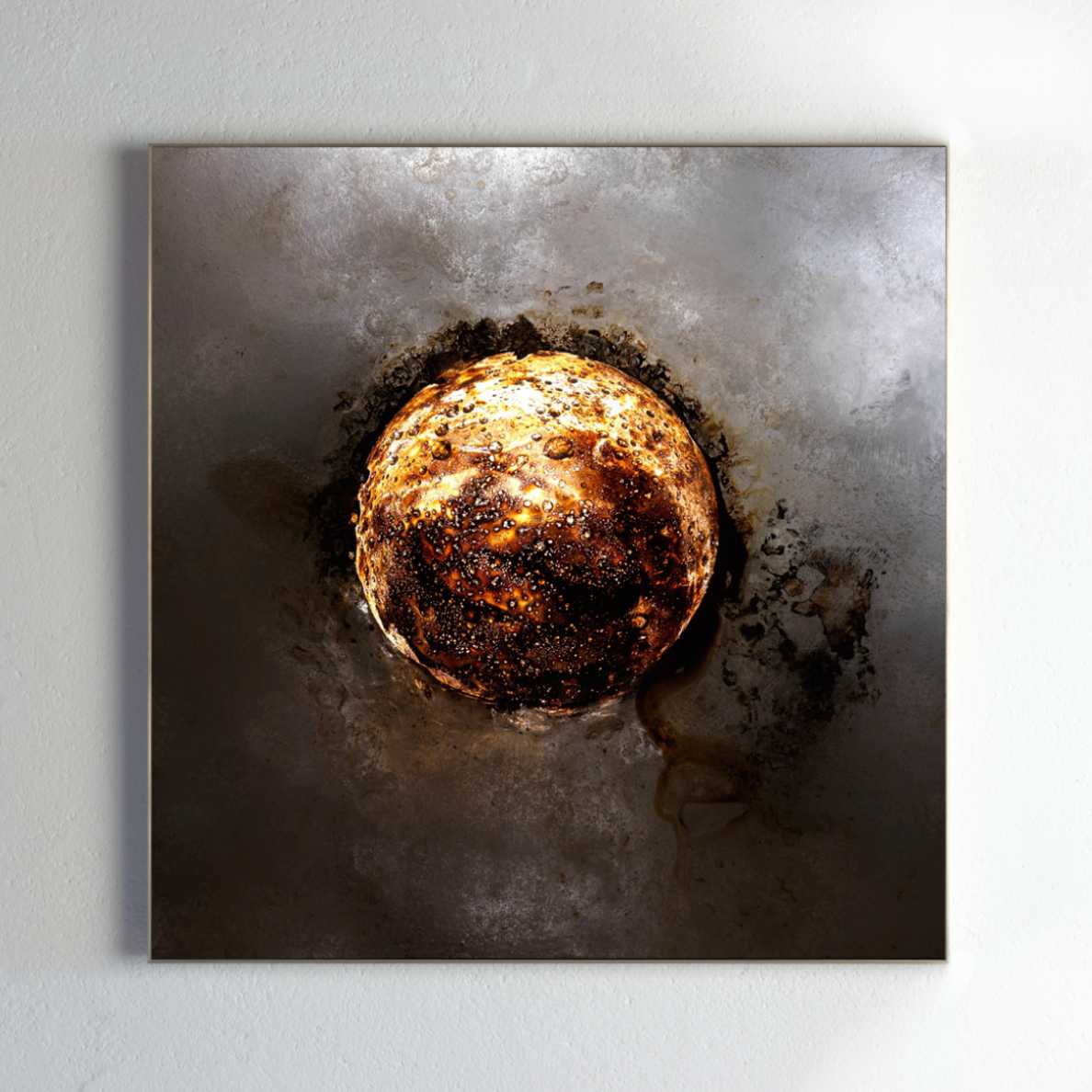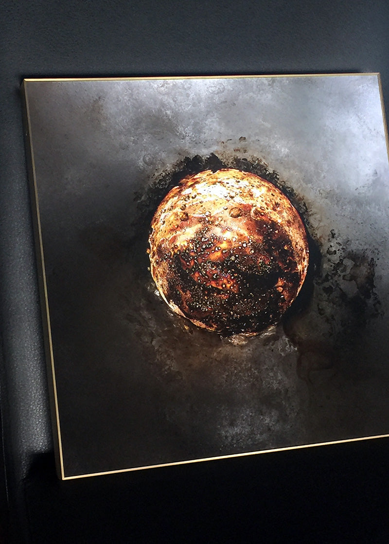 a large ossuary of crude oil & river water taken directly from below the thick ice of the Yenesei river are frozen together in temperatures below minus 50 degrees. This is done in a field studio deep in the forests of Siberia specifically to enable a thermo dynamic process ´enthalpy of fusion´. Vast pressures are created inside the sculpture, resulting in unrepeatable gas formations, fissures & wax secretions that are then photographed on analogue film plates